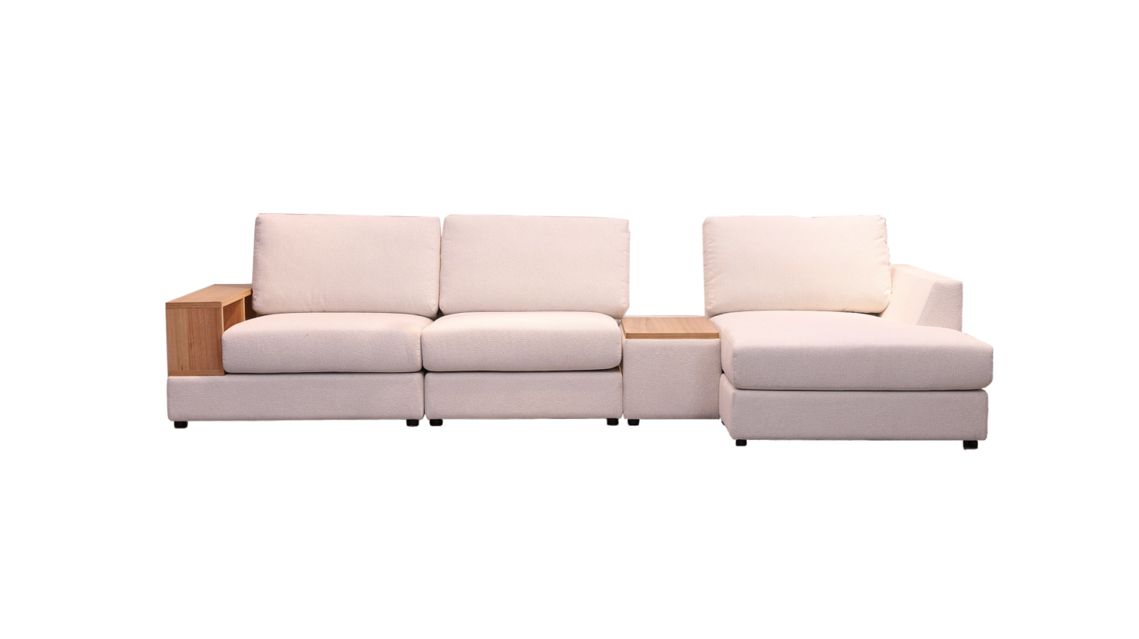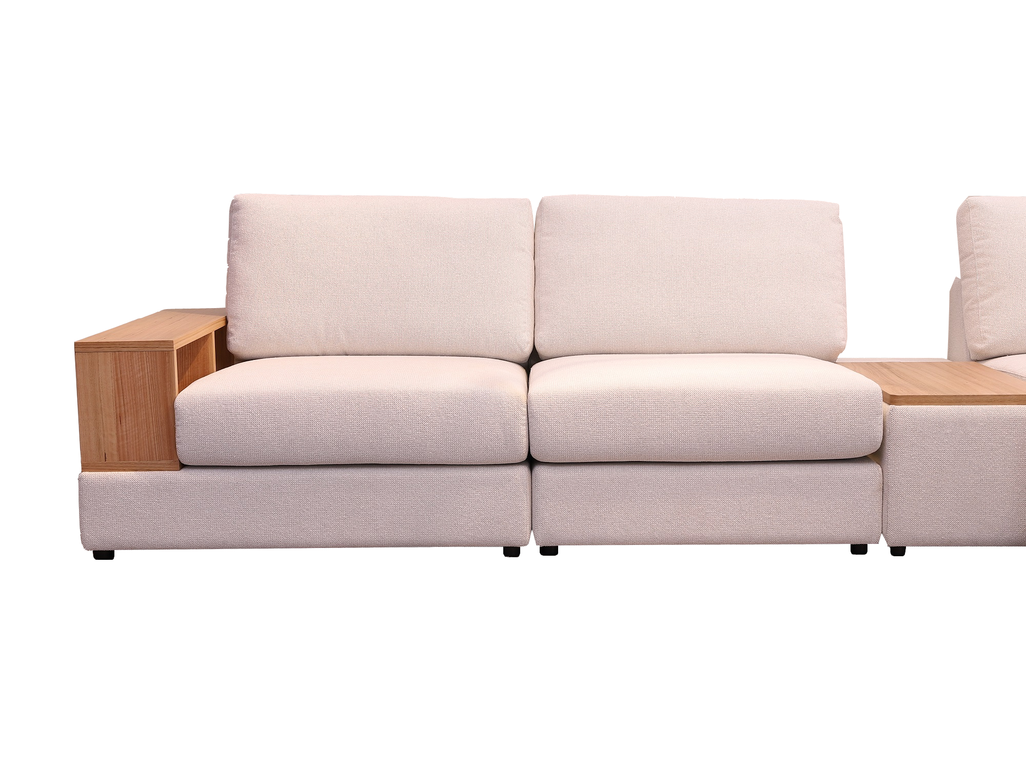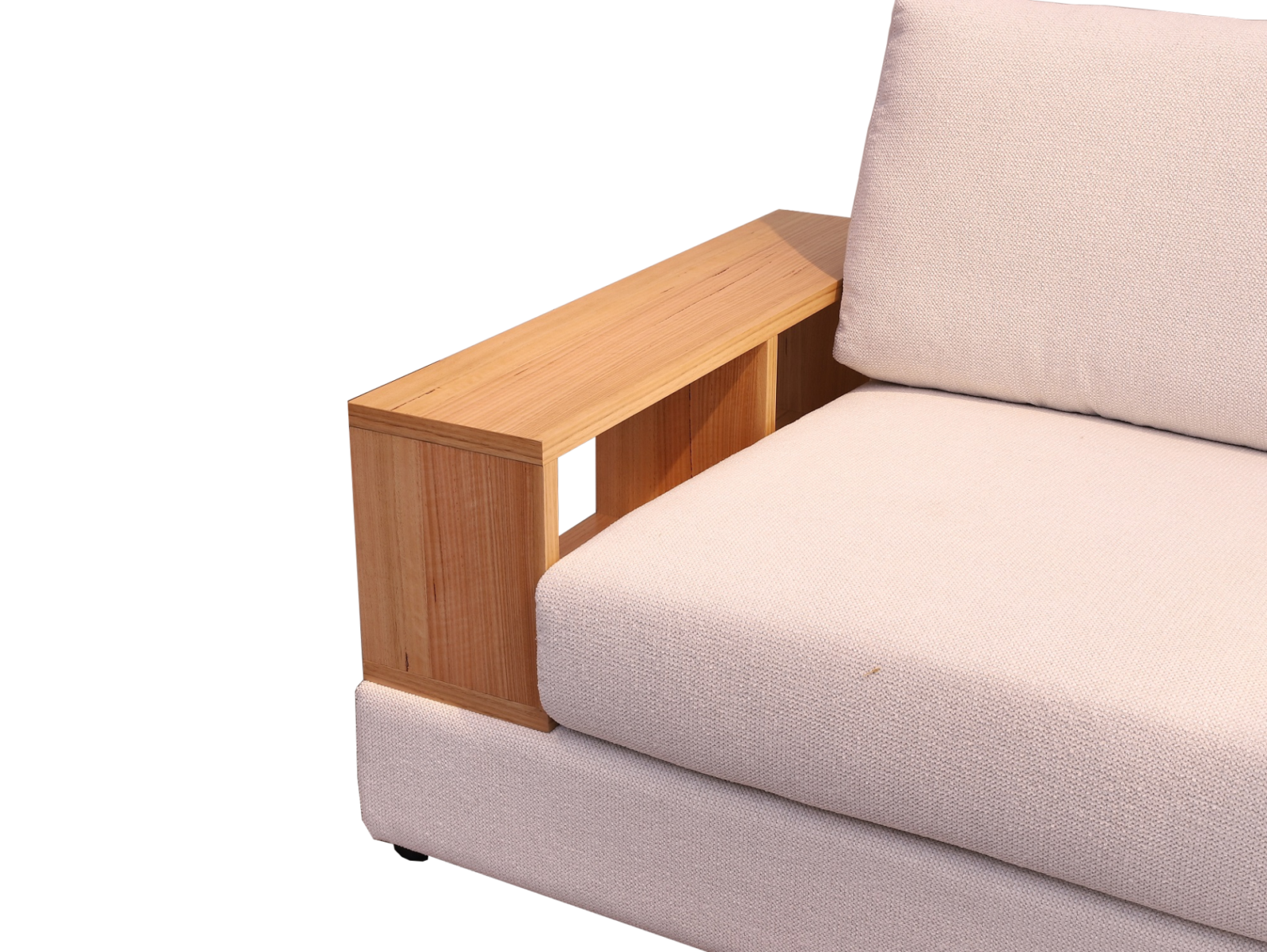 The Kara Modular Sofa combines premium textured cream upholstery with Marri timber, featuring an architectural armrest with integrated open shelving. Its modern utility is defined by a central gas-lift storage console equipped with a built-in wireless charging pad. The low-profile silhouette highlights the Marri's natural honey tones and dark gum veins.