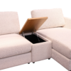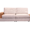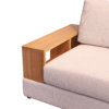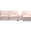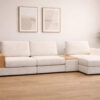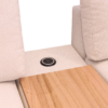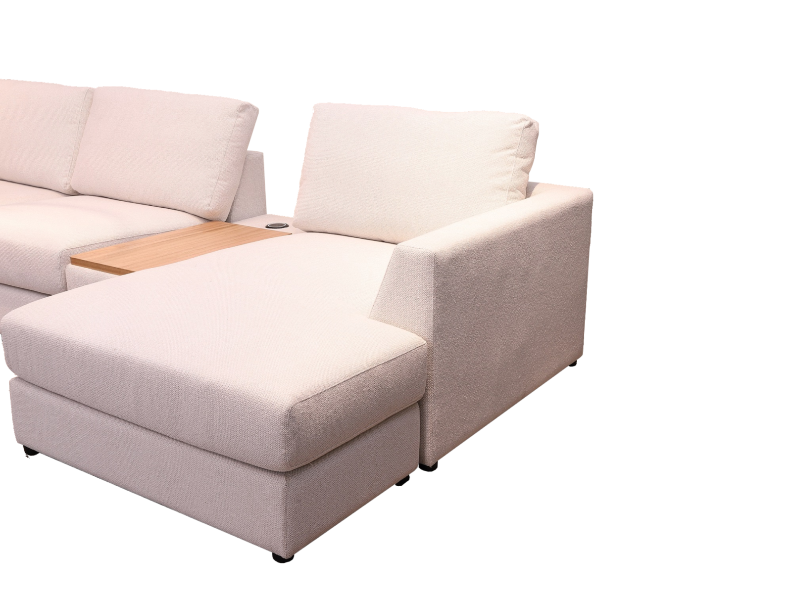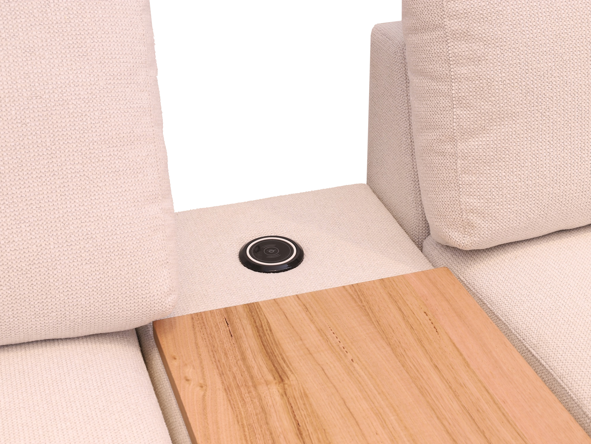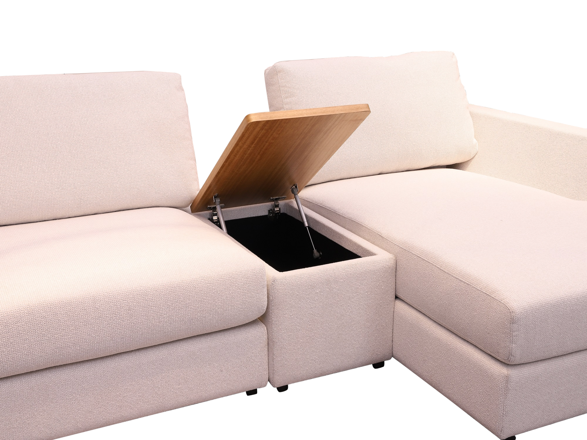 The Kara Modular Sofa combines premium textured cream upholstery with Marri timber, featuring an architectural armrest with integrated open shelving. Its modern utility is defined by a central gas-lift storage console equipped with a built-in wireless charging pad. The low-profile silhouette highlights the Marri's natural honey tones and dark gum veins.