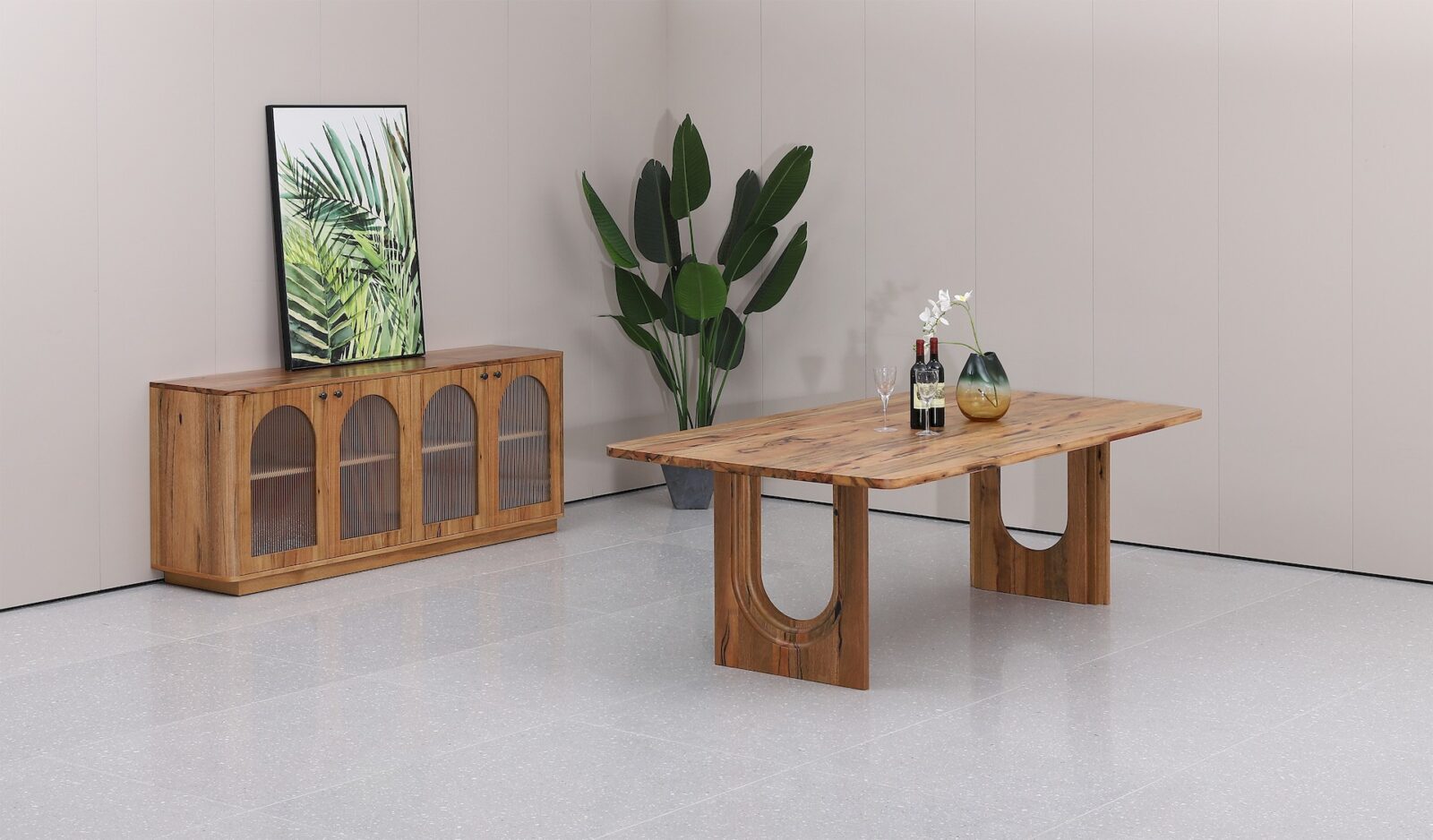 This Palm Cove Dining Table embodies exquisite solid wood furniture, crafted from marri wood, a unique Australian hardwood.
