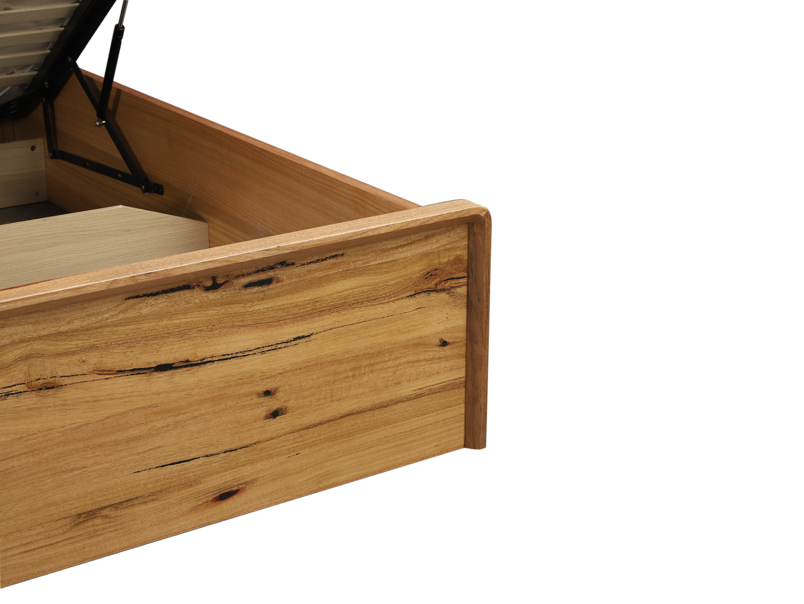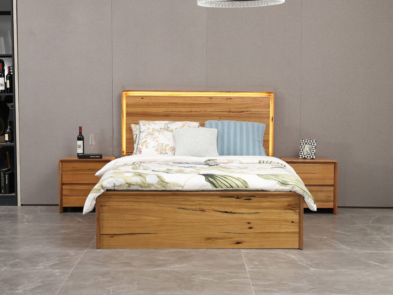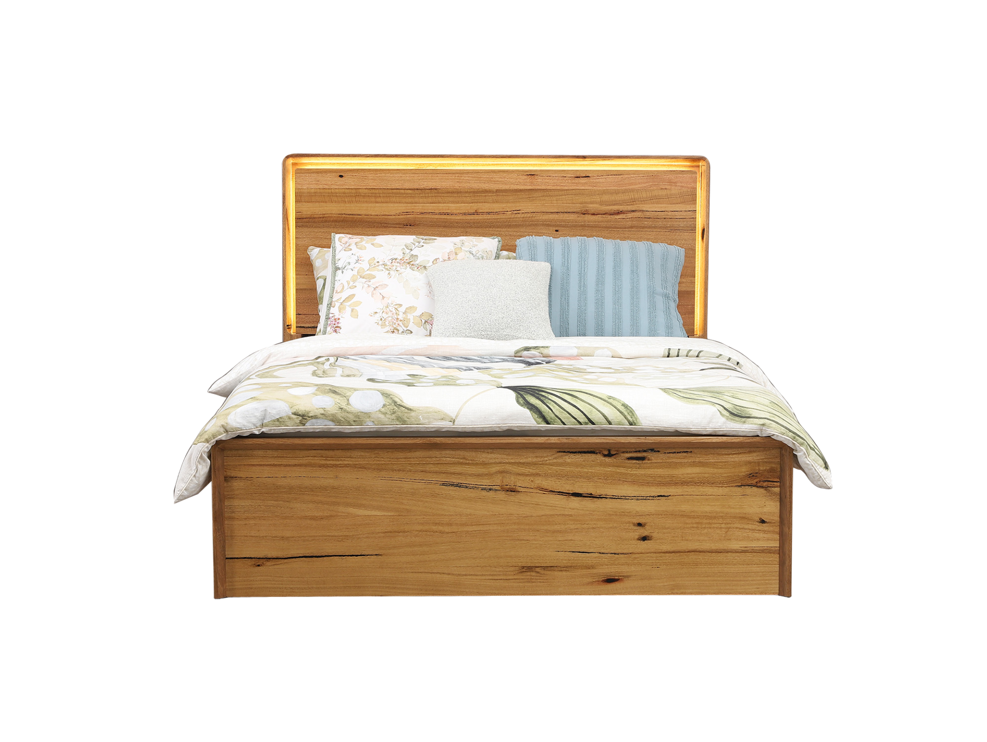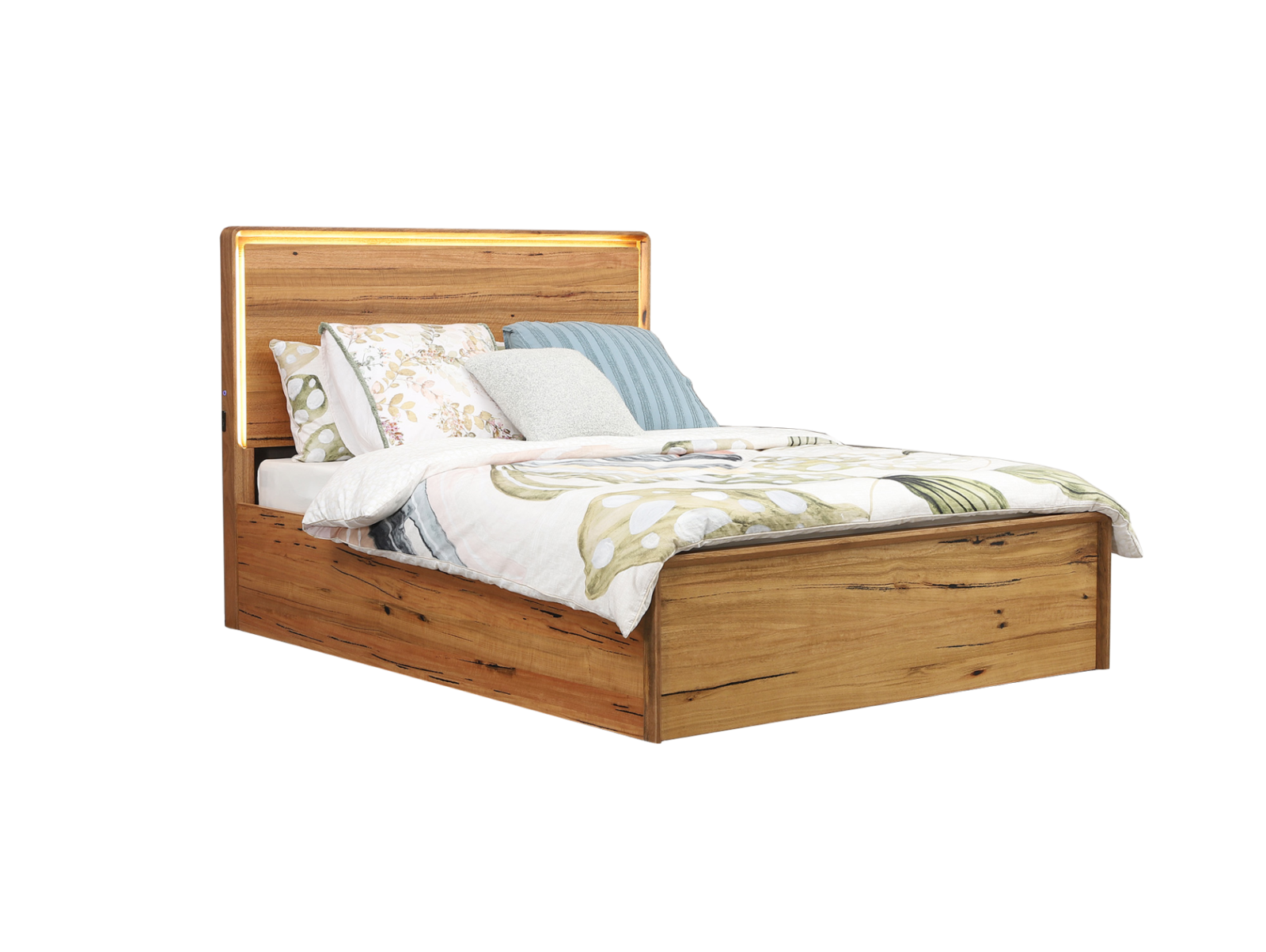 The Petermann Gas-Lift Bed is the ultimate bedroom multitasker, combining a bold, architectural look with a massive amount of hidden storage.The centerpiece is a high-profile headboard that showcases the raw beauty of West Australian timber, finished with built-in LED backlighting and integrated USB charging ports for your tech.