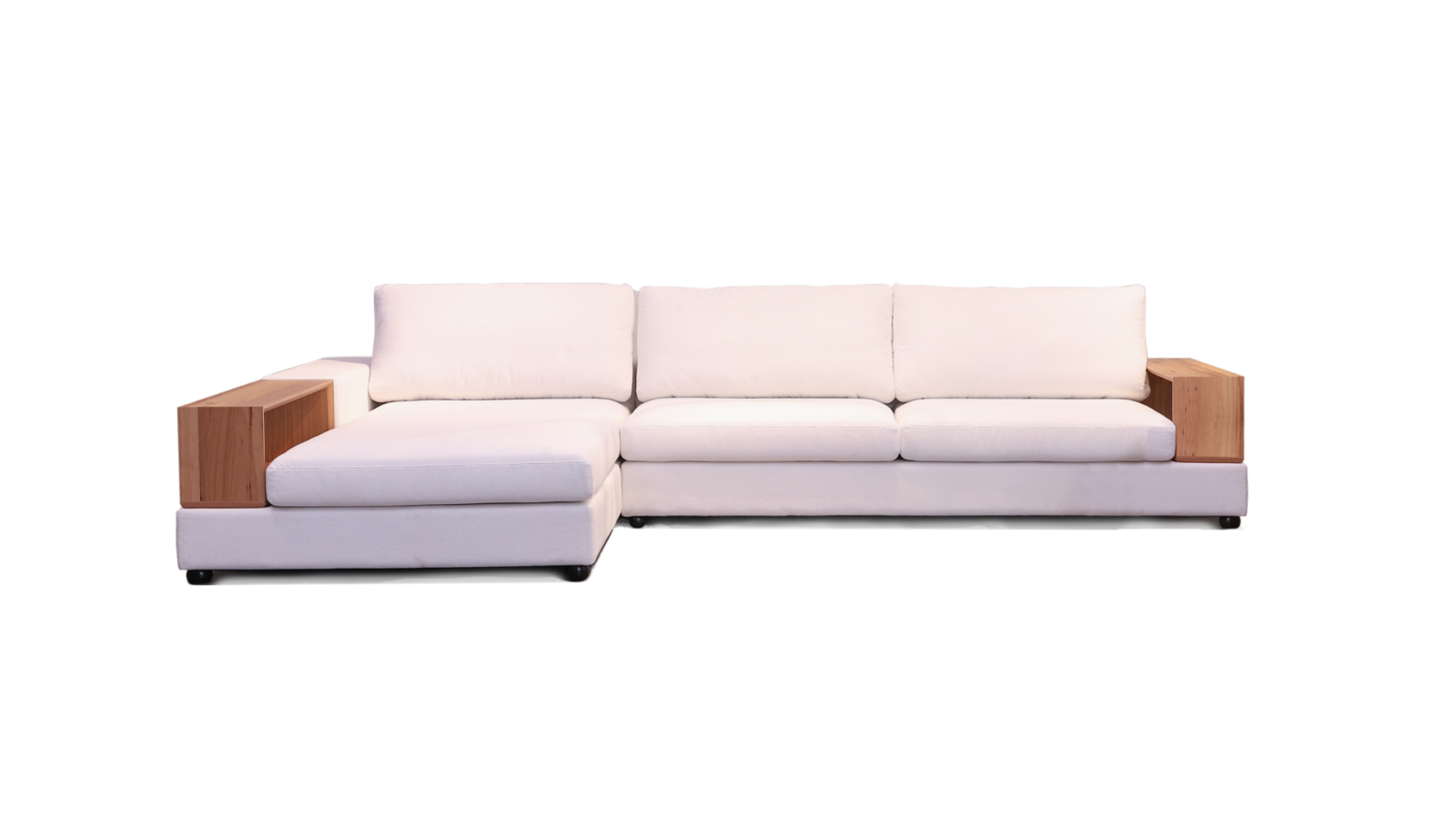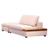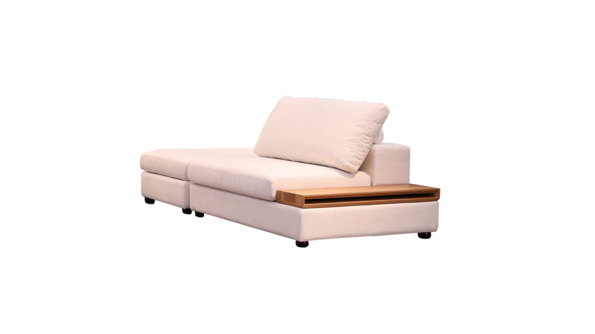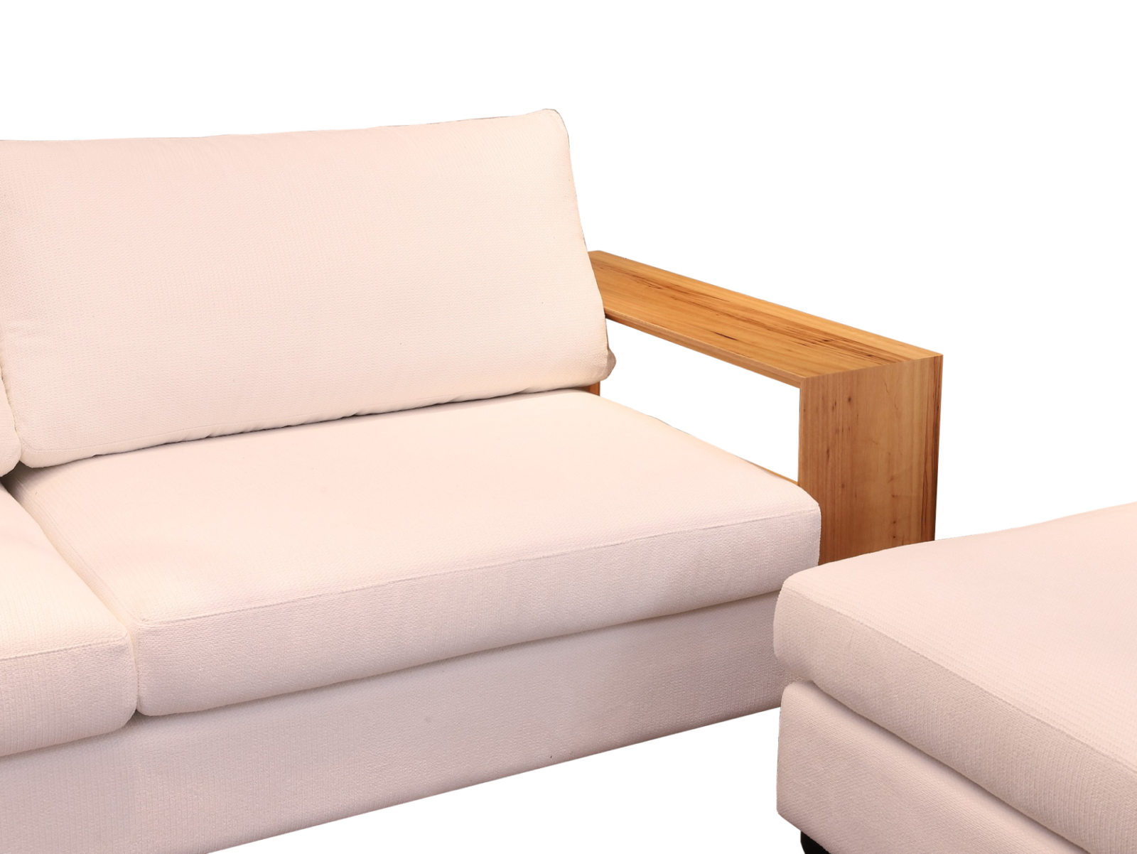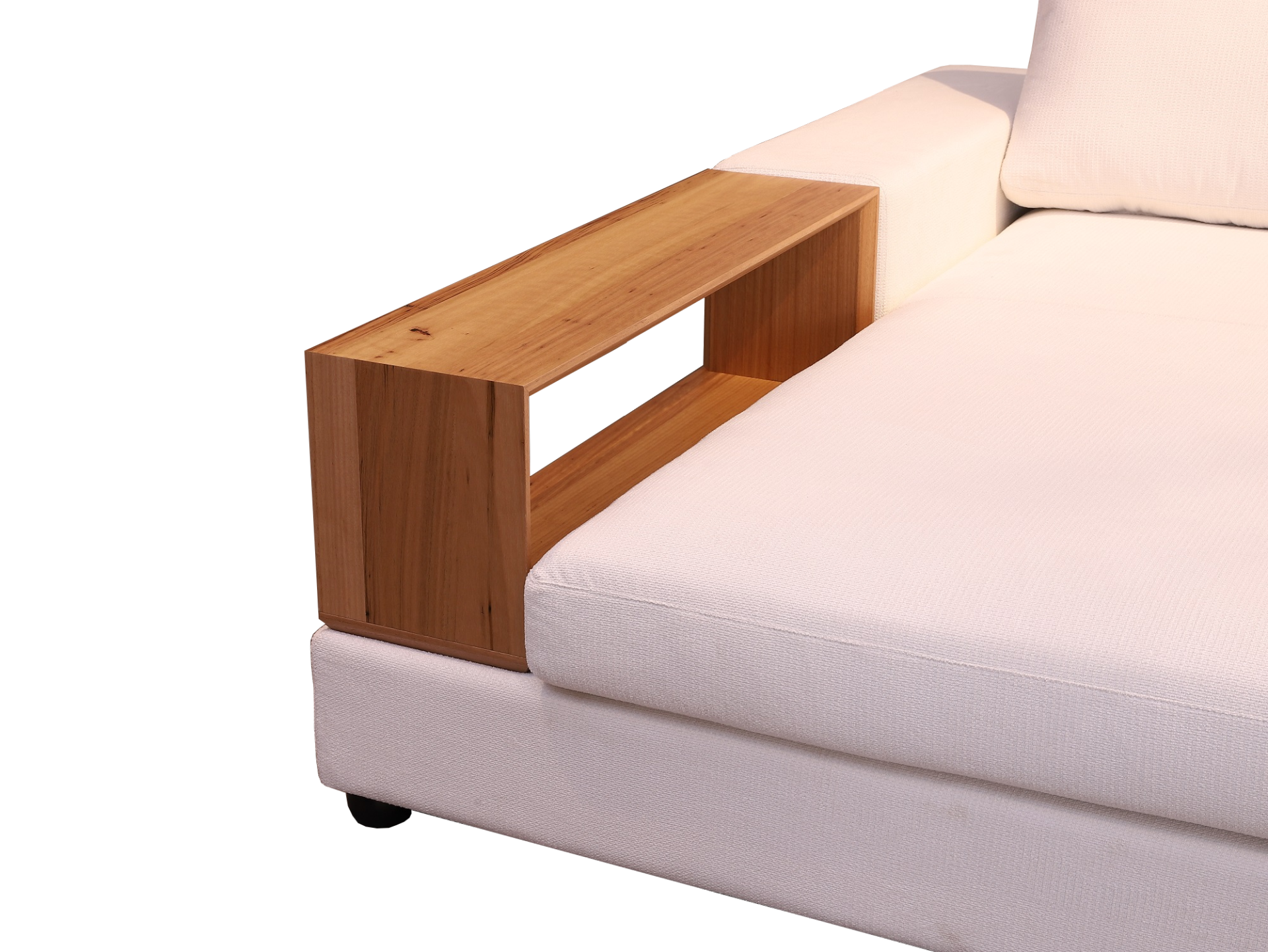 The Tara Modular features high-density foam seating upholstered in a premium textured cream weave, anchored by a Marri timber armrest with precision-integrated open shelving.