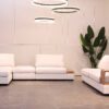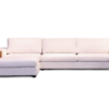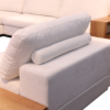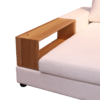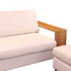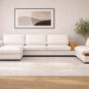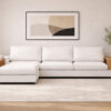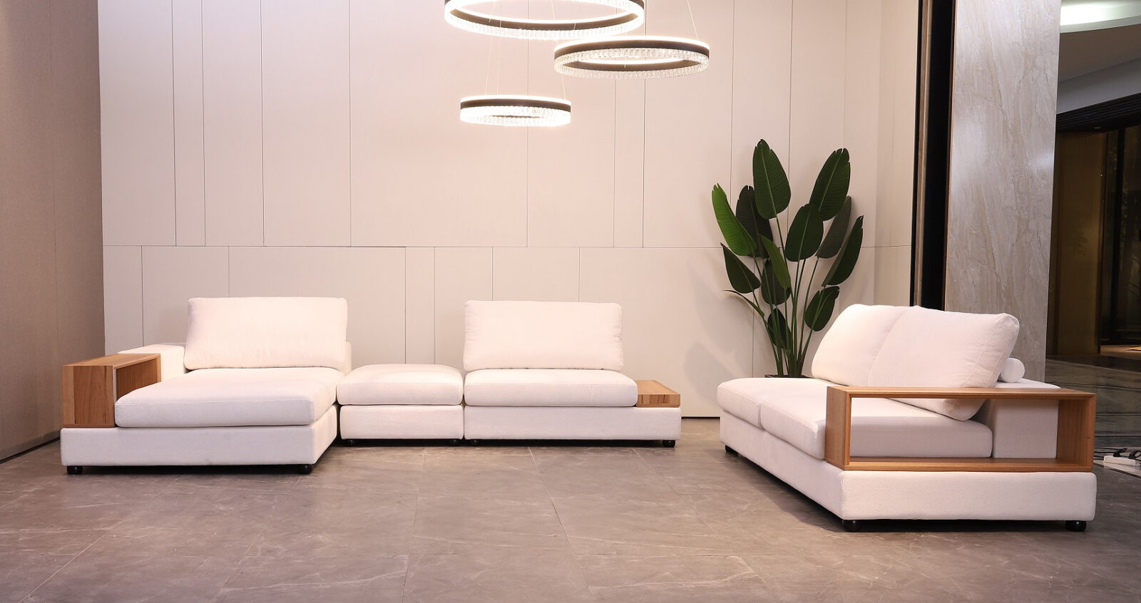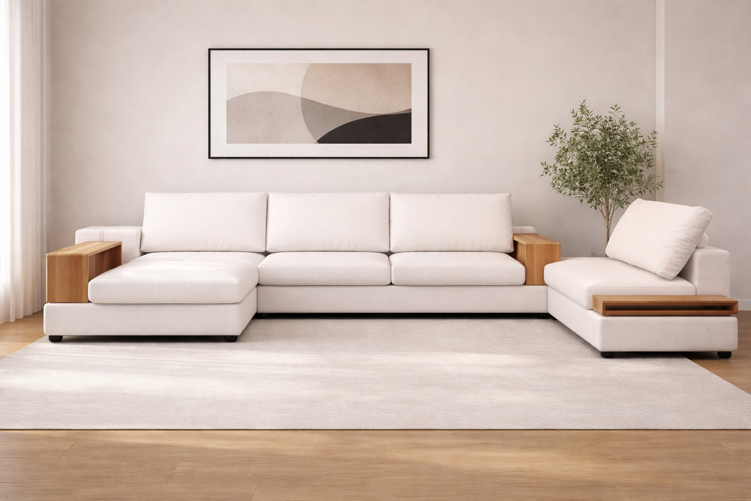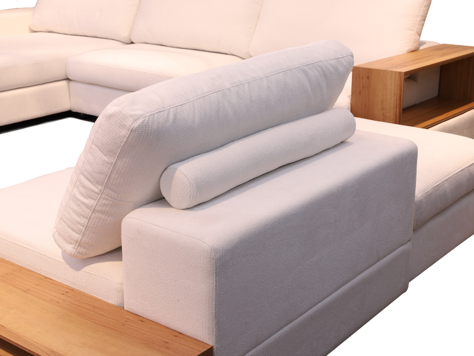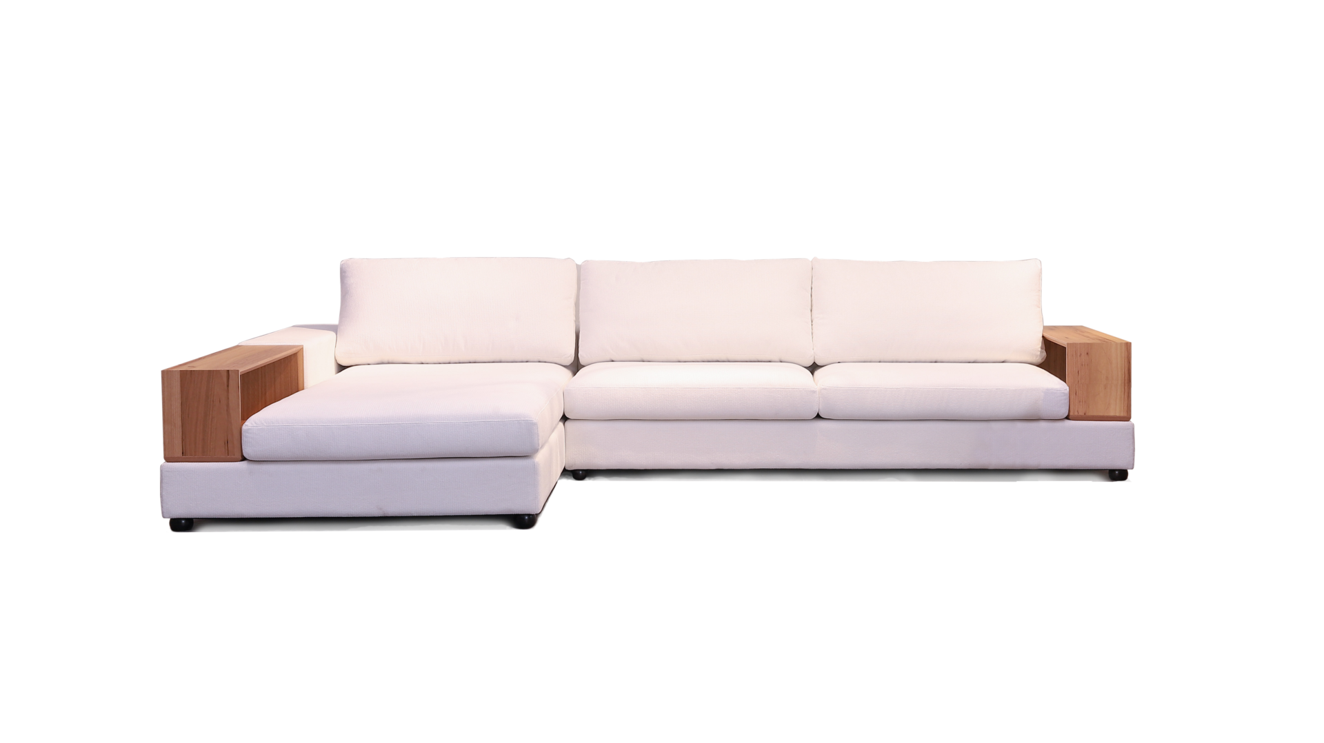 The Tara Modular features high-density foam seating upholstered in a premium textured cream weave, anchored by a Marri timber armrest with precision-integrated open shelving.